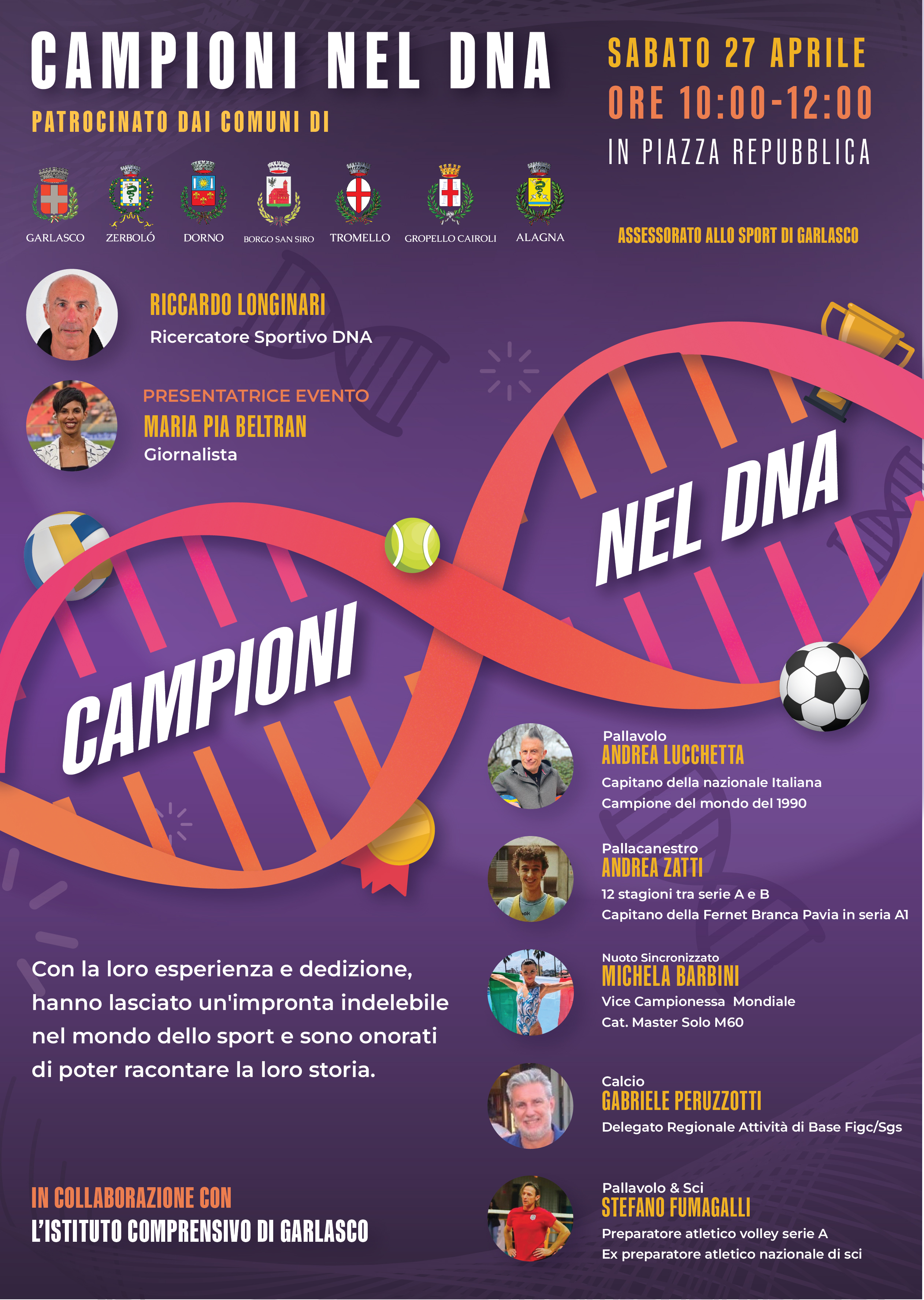 Si avvisa la cittadinanza che sabato 27 aprile 2024 alle ore 10.00 in Piazza della Repubblica a Garlasco, con il patrocinio dei Comuni di Garlasco, Zerbolò, Dorno, Borgo San Siro, Tromello, Gropello Cairoli ed Alagna e la collaborazione dell'Istituto Comprensivo di Garlasco, è organizzato l'evento dal titolo "Campioni nel DNA", come da volantino allegato
